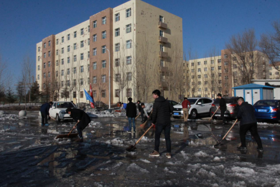 在清理积雪的过程中,由于积雪较多,部分道路有结冰现象,志愿者们参与性极高、奋勇当先、团结协作,充分发挥团队合作精神,奋力铲除积雪。