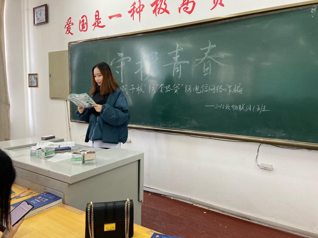在班会上,班委成员为同学们播放防网络诈骗的宣传片。之后又以“校园套路贷”“电信网络诈骗”“网络购物诈骗”等几种常见的诈骗方式进行讲解,为同学们详细介绍了它们的来源、存在方式、诈骗形式以及严重危害,使同学们能够对其更为了解,提高自己的防范意识。本次活动的开展,使得同学们了解了流行的诈骗形式,加强防范意识,更有助于帮助学生理性应对诈骗情况,从而保护自身利益不受侵犯。