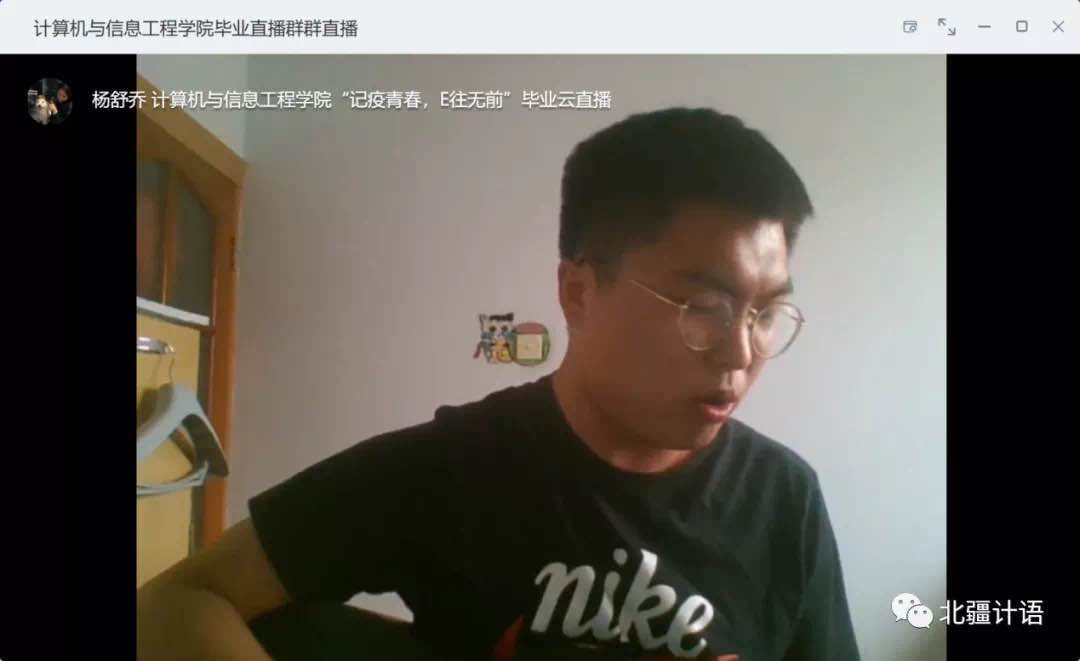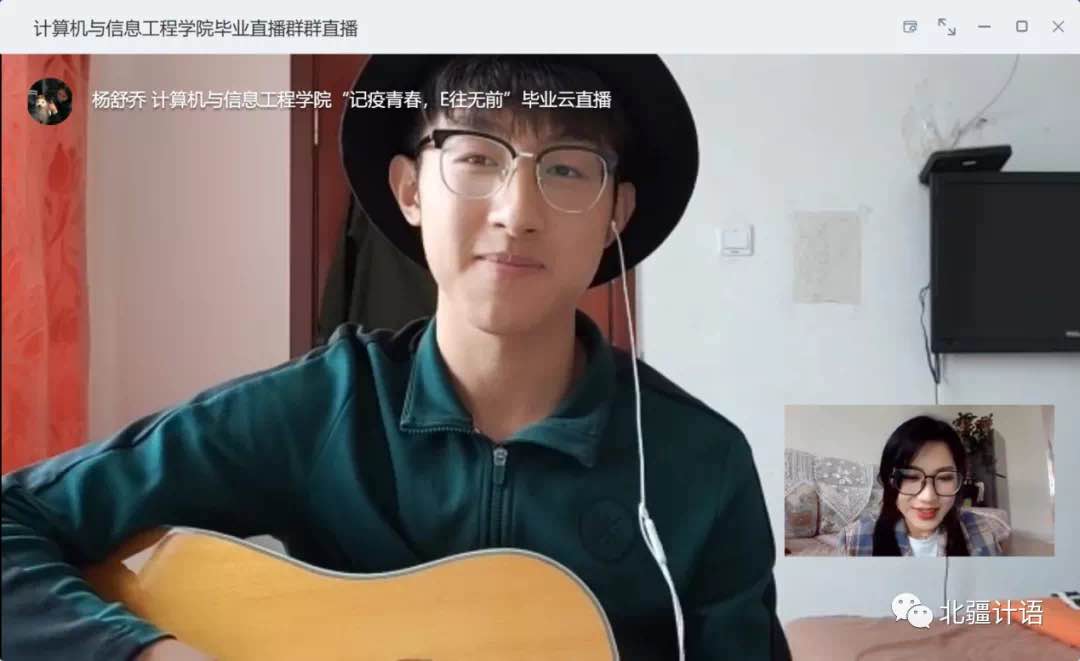 在直播的过程中主持人连麦在校生代表,他们以优美动听的歌声来表达他们对学长学姐的美好祝愿,其中19级通信工程2班的朱新宇演唱的《车站》,自己创作的《那年夏天》勾起了大家很多美好的回忆,很多同学都表示意犹未尽,怀念学校的一切。其中16级两名毕业生也在自己的家中分别带来了他们大学最后的一首歌曲、一段舞蹈,这样谢幕也是一段不一样的回忆。三位辅导员王亚楠、王琦、才忠全也以一首《相信未来》诗朗诵,祝愿所有毕业生相信自己,相信美好的未来在等待着大家。