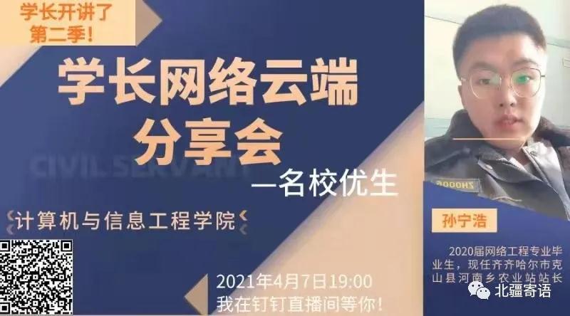 2021年4月7日晚上7点,计算机与信息工程学院第二季第二期云分享会“学长开讲啦”在钉钉平台又和大家见面了。应邀参加此次分享会的主讲嘉宾是我院2020届网络工程专业毕业生孙宁浩,现工作于黑龙江省齐齐哈尔市克山县河南乡农业站站长。此次分享的主题为“名校优生”。