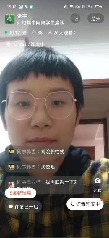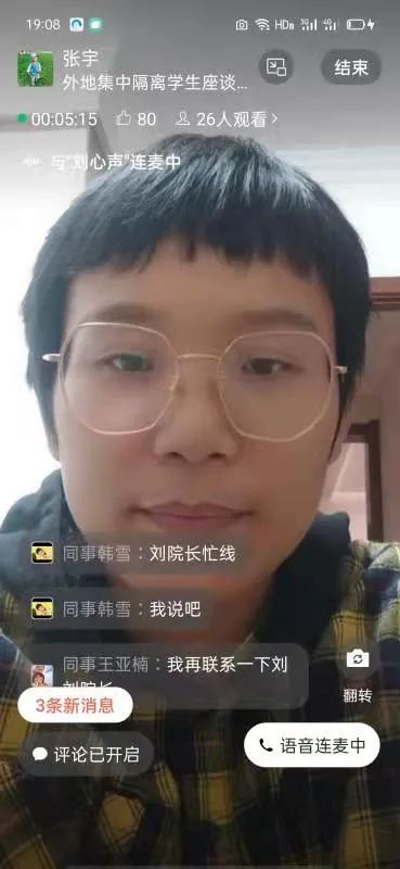 学院为了进一步了解转运外地学生所急所需,于2021年11月7日晚19:00召开了由全体包保老师和转运外地集中隔离学生共同参加的线上座谈会。会上,针对同学们提出来的问题,学院领导和老师们做了一一解答。同时刘心声院长强调全体同学须主动遵守隔离地点的相关要求,韩雪书记鼓励同学们不但要有战胜疫情决心和信心,还要常怀感恩之心,感谢转运工作人员和隔离所在地工作人员的辛勤付出。会后,同学们纷纷表示会积极调整心态,坚持锻炼好身体,严格遵守学校网课学习作息规定,模范遵守各项隔离防控要求,同全市人民、全校师生一起努力,共克时艰!