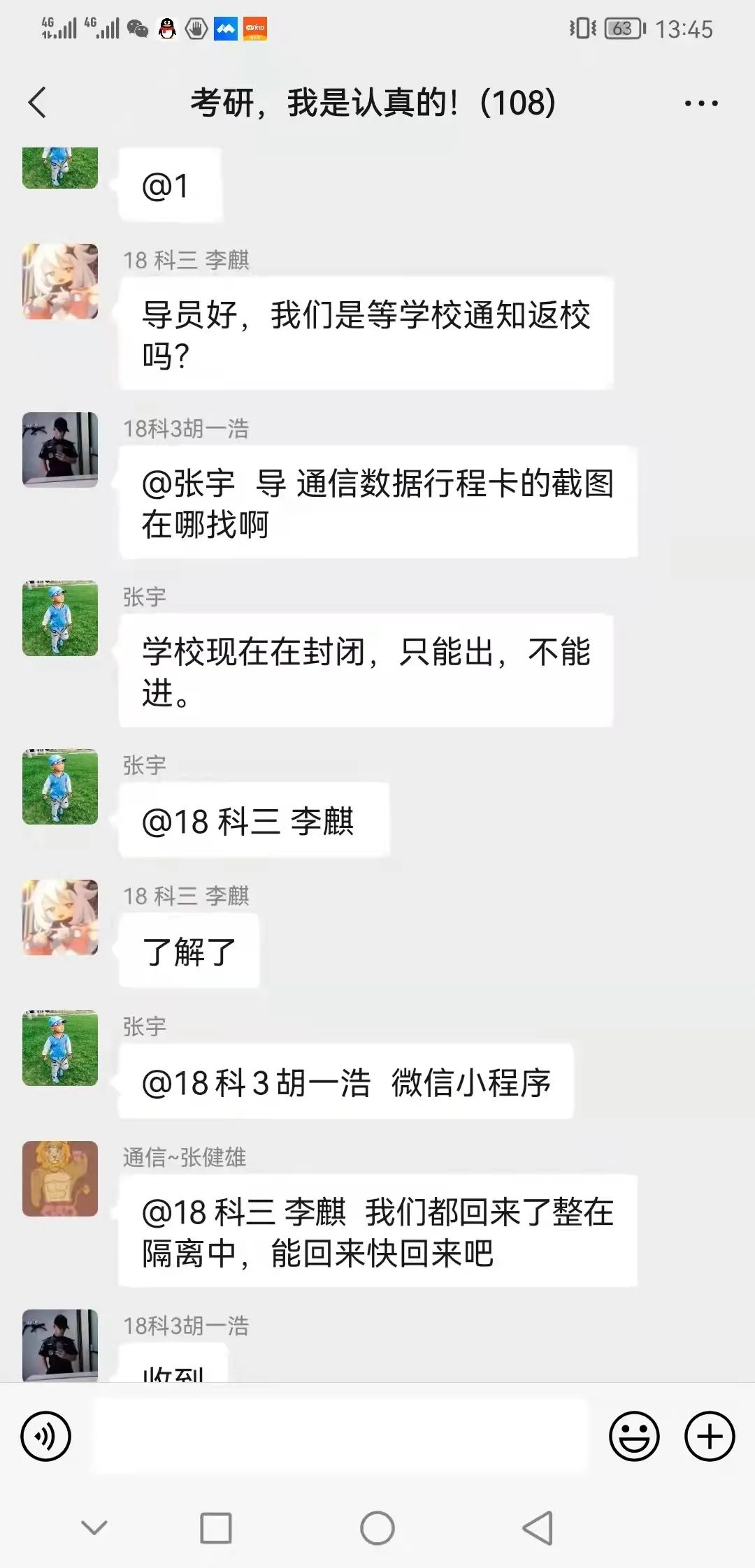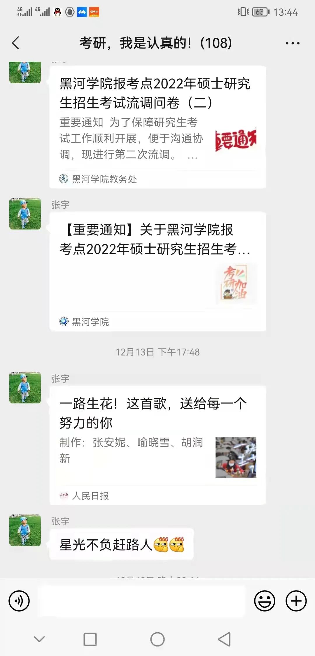 10月27日,黑河市发现新型冠状病毒确诊病例,突发疫情让众多学子感到慌张,计算机与信息工程学院依托为考研学生建立的“考研,我是认真的!”微信群发布暖心通告,告诉学生安心复习,静待疫情结束!