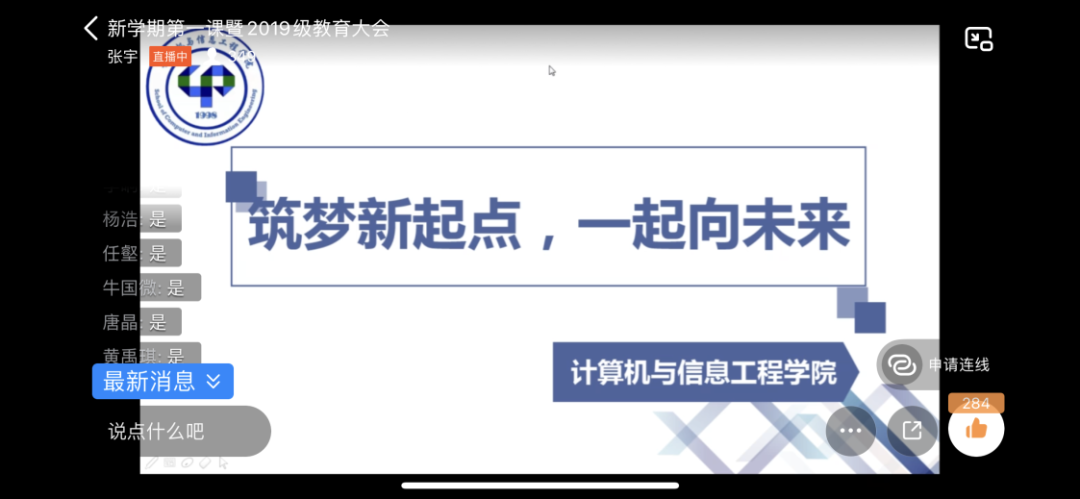 为扎实做好新学期开学工作部署、思想政治教育、学生线上课堂动员、疫情防控等工作,落实学校“开学不返校、线上云课堂”的总体部署,计算机与信息工程学院分年级召开线上“筑梦新起点、一起向未来”新学期第一课学生教育讲座。