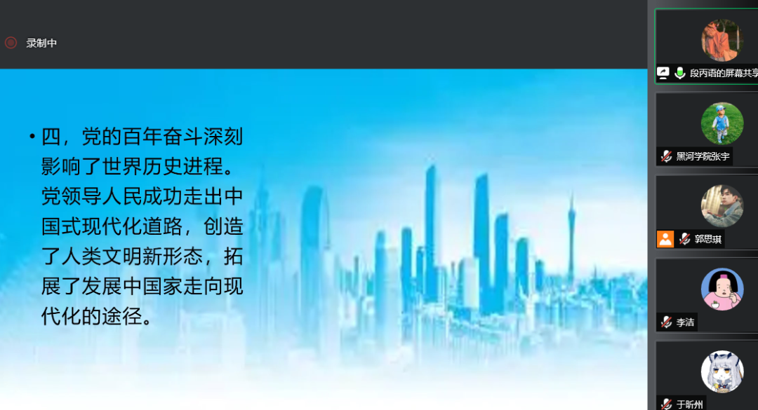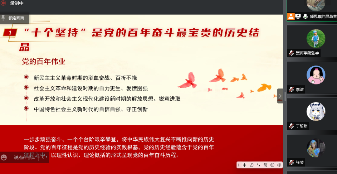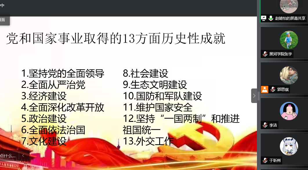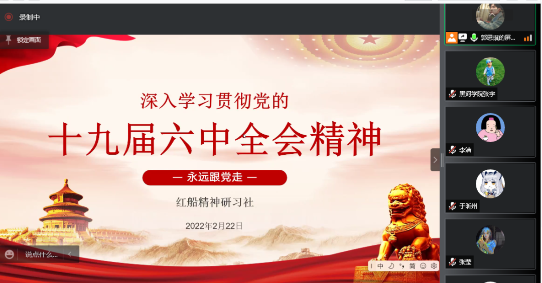 2月22日上午10点,我院红船精神研习社社团在腾讯会议平台进行首场十九届六中全会精神学习宣讲,会议由社团团长郭思琪同学主持,社团指导教师张宇和全体社团成员参会。