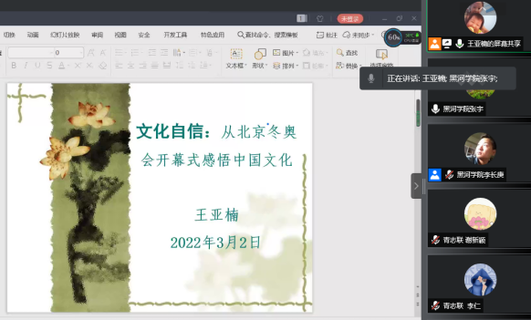 20级辅导员王亚楠老师组织线上班会,全年级同学参与,王亚楠老师会中讲述冬奥会开幕当天恰逢中国的“立春”节气,开幕式倒计时以中国二十四节气的时间推进,把最后一秒留给了立春,在每一个节气背后都是一句脍炙人口的诗词,寓意着我们从立春出发,从冬奥出发,共同迎接一个新的春天,共同分享冬奥体育盛会,共同携手,一起向未来。“中国诗词”的美好意境为世界各国健儿加油。北京已经准备好了,欢迎世界各国的奥运健儿共同从“立春”出发,奋力拼搏,搏出一片天地、搏出一个未来。
