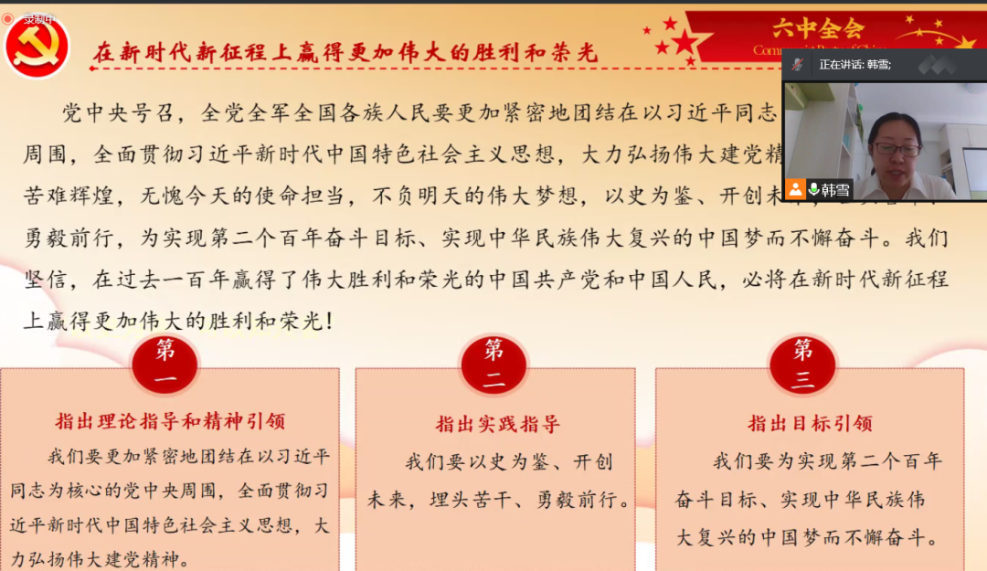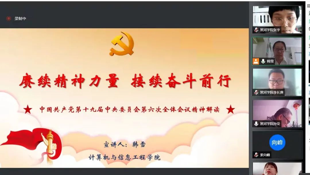 中国共产党第十九届中央委员会第六次全体会议已经胜利闭幕多时。为了认真传达习近平总书记重要讲话精神,学习党的十九届六中全会精神,计算机与信息工程学院在2022年3月2日下午以线上宣讲会的形式开展了党的十九届六中全会精神的学习会议,宣讲会由计算机与信息工程学院党总支书记韩雪主讲,全体教职工全部参加。