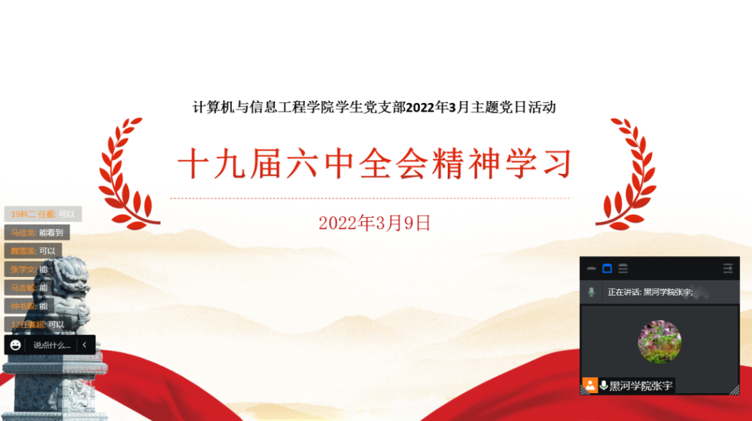 3月9日下午15:30,我院学生党支部开展新学期第一次线上主题党日活动。本次活动主题是热议党的十九届六中全会精神基层宣讲提纲走进学校部分。会议由学生党支部书记张宇主持,19级通信2班刘浩然和19级科技2班任壑两名同学做交流发言。