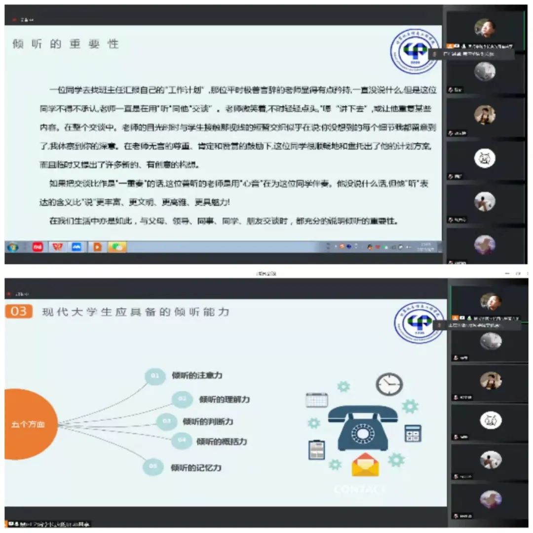 4月7日中午13:00,我院第四期首届职业素养能力提升培训准时在腾讯会议举行,本期学习主题为倾听,由2021级年级辅导员李长庚老师主讲,张宇老师和王亚楠老师以及训练营的全体成员参加。
