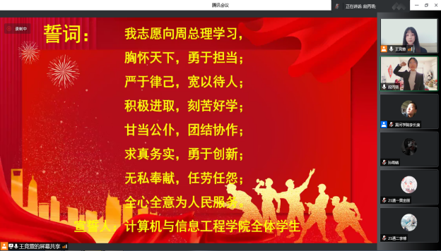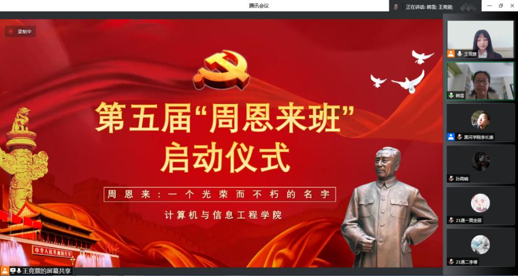 为了全面贯彻党的教育方针和全国教育大会精神,落实黑河学院第五届“周恩来班”创建工作要求,计算机与信息工程学院5月25日下午在腾讯会议召开黑河学院第五届“周恩来班”创建工作启动仪式。学院党总支书记韩雪教授,全体辅导员、班主任,2019级学生代表,2020级班级干部及2021级全体同学参加。