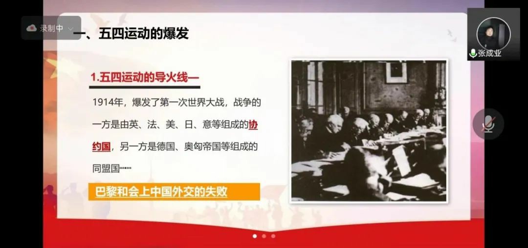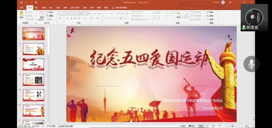 为纪念五四爱国运动,激发青年团员爱党爱国爱团的热情,计算机与信息工程学院就业指导社团,于5月4日14时在腾讯会议开展“纪念五四爱国运动”主题宣讲活动,张成业同学主持,全体社团成员参加活动。