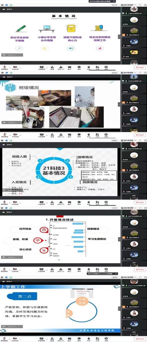 为了迎接新学期各项工作安排,更好的落实计算机学院班主任的工作内容,计算机与信息工程学院于2022年8月19日下午14:00利用腾讯会议召开2022年上半年班主任工作述职会议。参加本次会议人员有:计算机与信息工程学院党总支书记韩雪,计算机与信息工程学院20级、21级班主任以及全体辅导员。