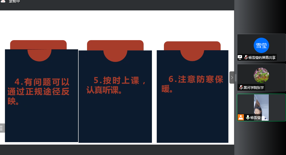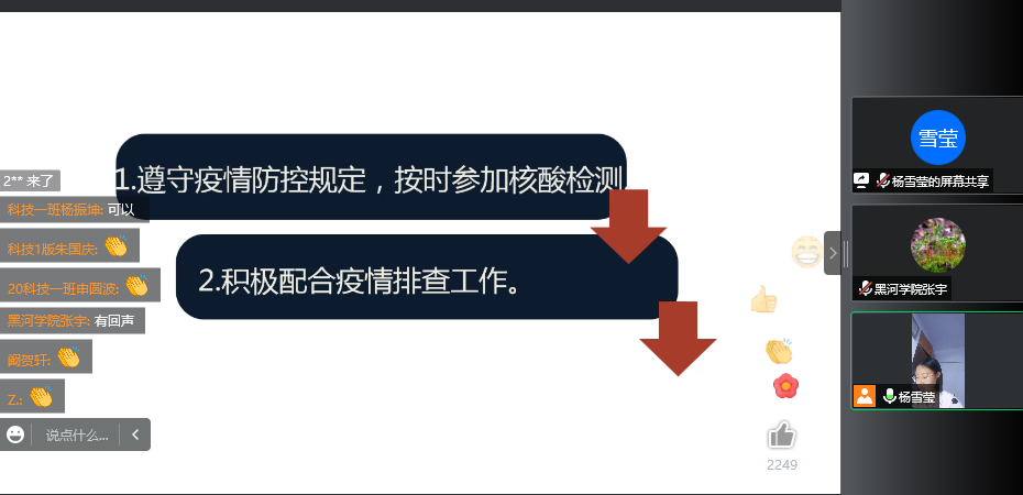 会议第一项,由学团办主任张宇老师介绍新任辅导员杨雪莹老师。作为新任辅导员,杨雪莹老师通过会议与大家强调几点要求。1.遵守疫情防控规定,按时参加核酸检测。2.积极配合疫情排查工作。3.不在公共平台发表不当言论。4.有问题可以通过正规途径反映。5.按时上课,认真听课。6.注意防寒保暖。期待与同学们相见在校园中。