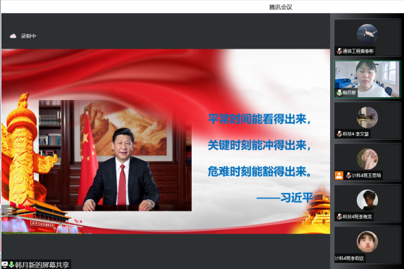最后,韩月新老师以习近平总书记“平常时间能看得出来,关键时刻能冲得出来,危难时刻能豁得出来”三句话勉励全体与会同学,鼓励同学们不断提高自身政治素养,积极向党组织靠拢,争取早日加入中国共产党,为祖国建设贡献自己的力量。