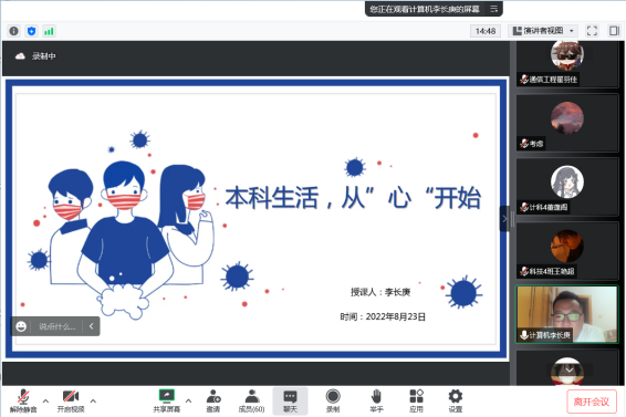 8月23日晚19点,计算机与信息工程学院2022专升本新生第六场入学教育在腾讯会议如期举行,本次教育大会的主题是——本科生活,从“心”开始。会议由杨智超老师主持,李长庚老师主讲。