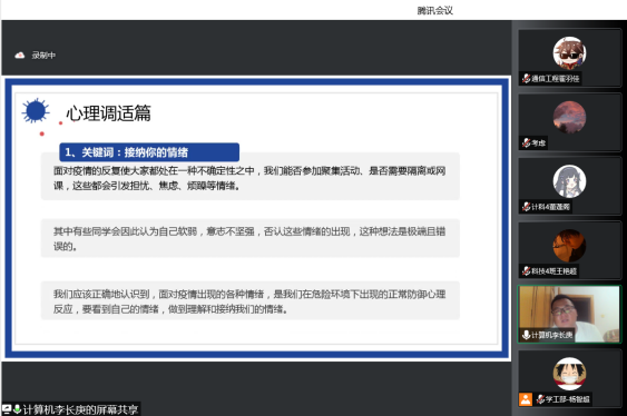 最后李长庚老师为大家介绍了学校的心理咨询室,希望大家能在疫情期间调整心情,保持心态,更加关注个人身心健康。