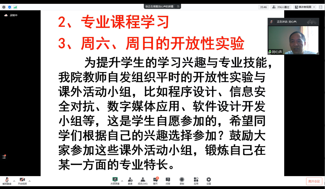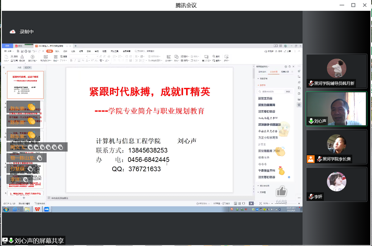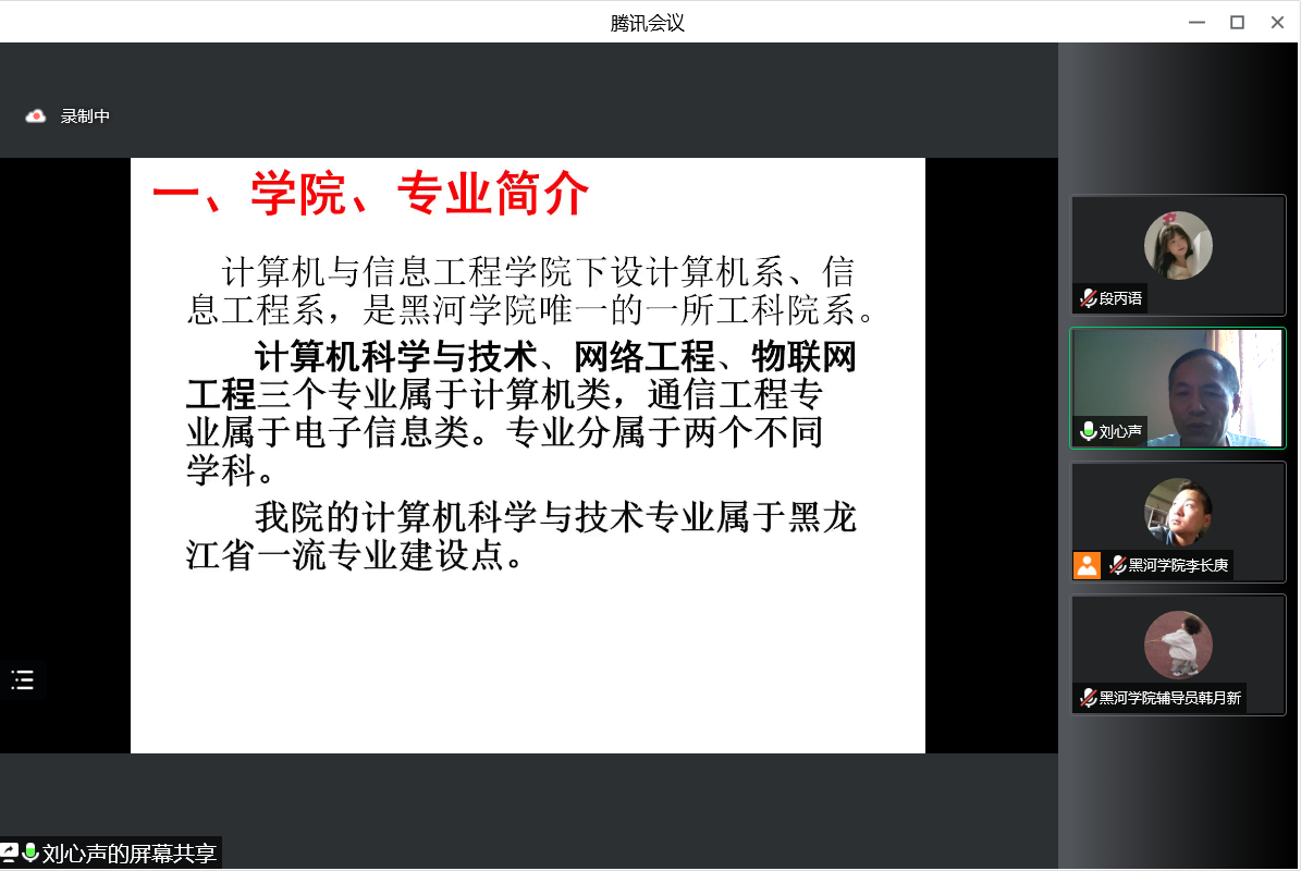为了进一步有效指导学生尽快的融入大学生活,更好的了解自己所学专业以及学院有关信息,计算机与信息工程学院于2022年9月5日下午15:30在腾讯会议召开以“紧跟时代的脉搏。成就it精英”为主题的线上入学教育活动第一场。会议邀请计算机与信息工程学院院长刘心声主讲,22级辅导员韩月新主持召开。