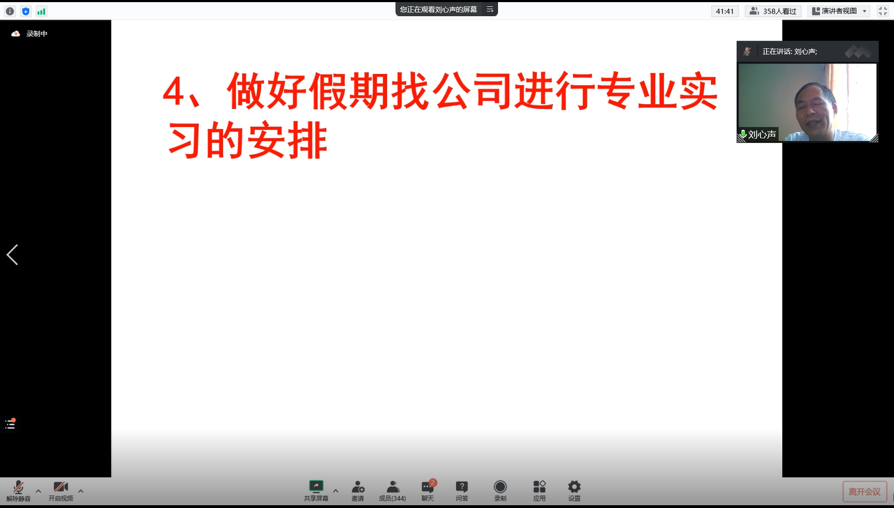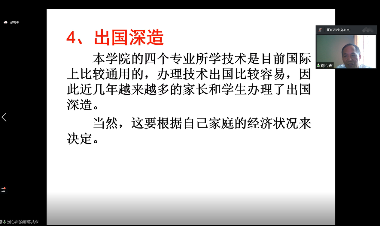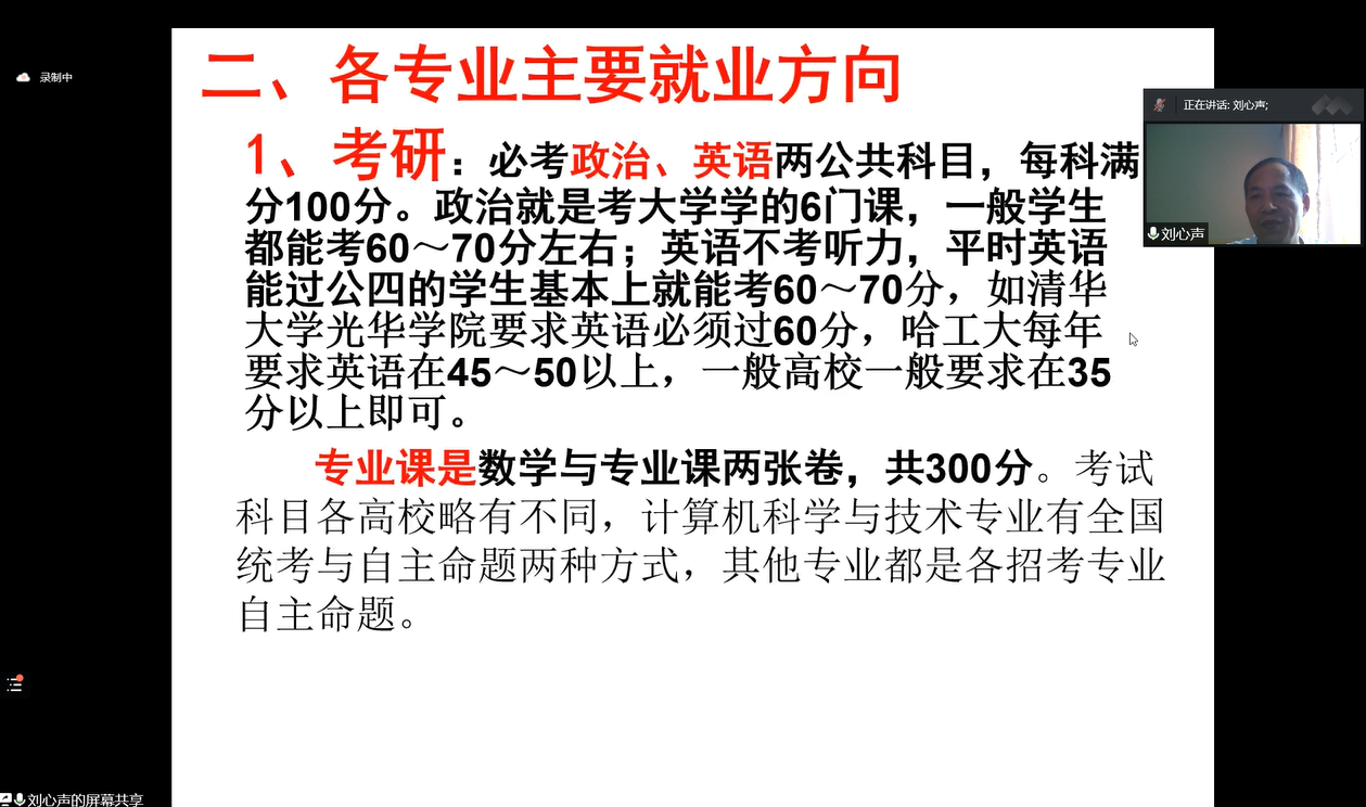 接着,刘院长就学院专业、教学能力、毕业去向做了详细的介绍讲解,其中重点介绍了考研、选调生以及出国留学等高质量就业相关内容。