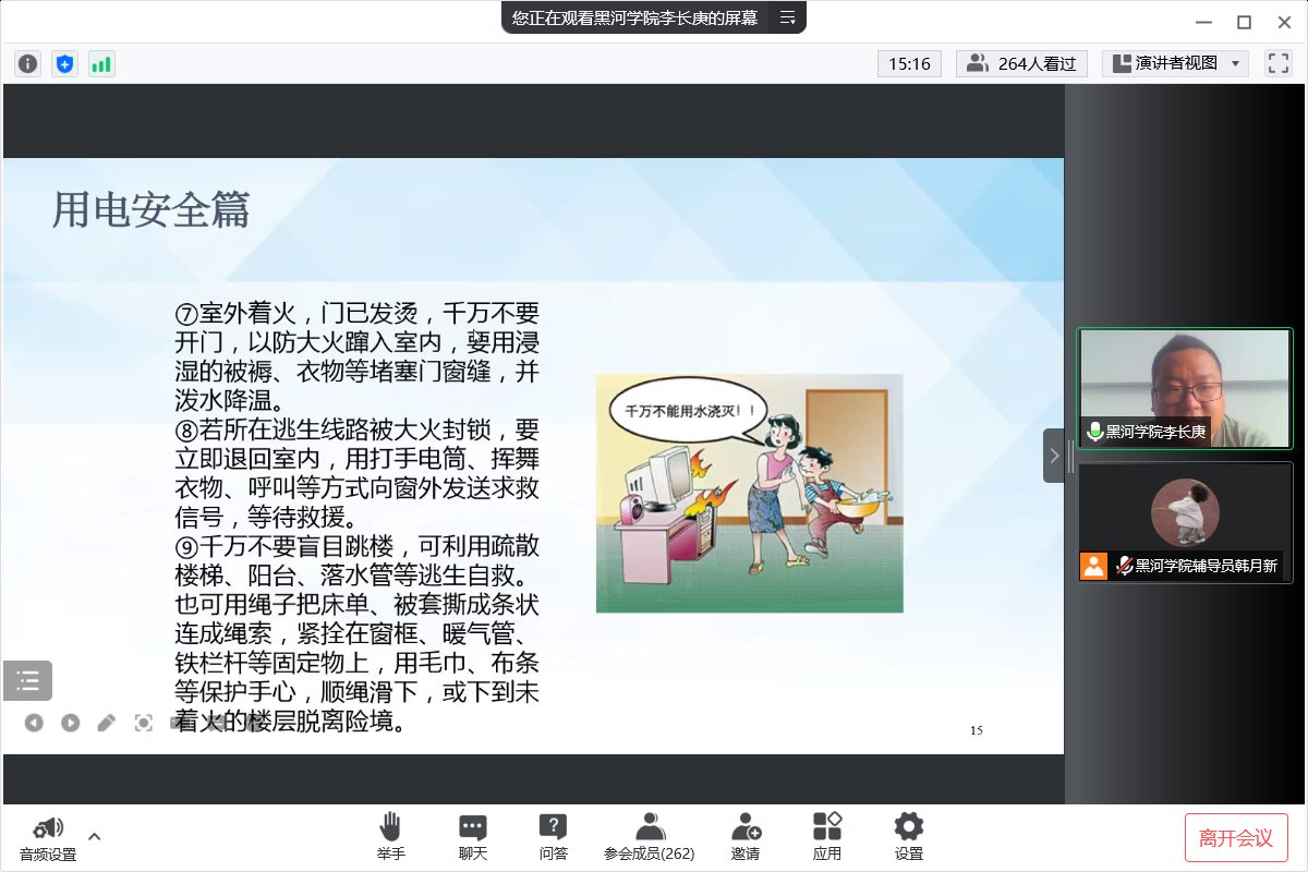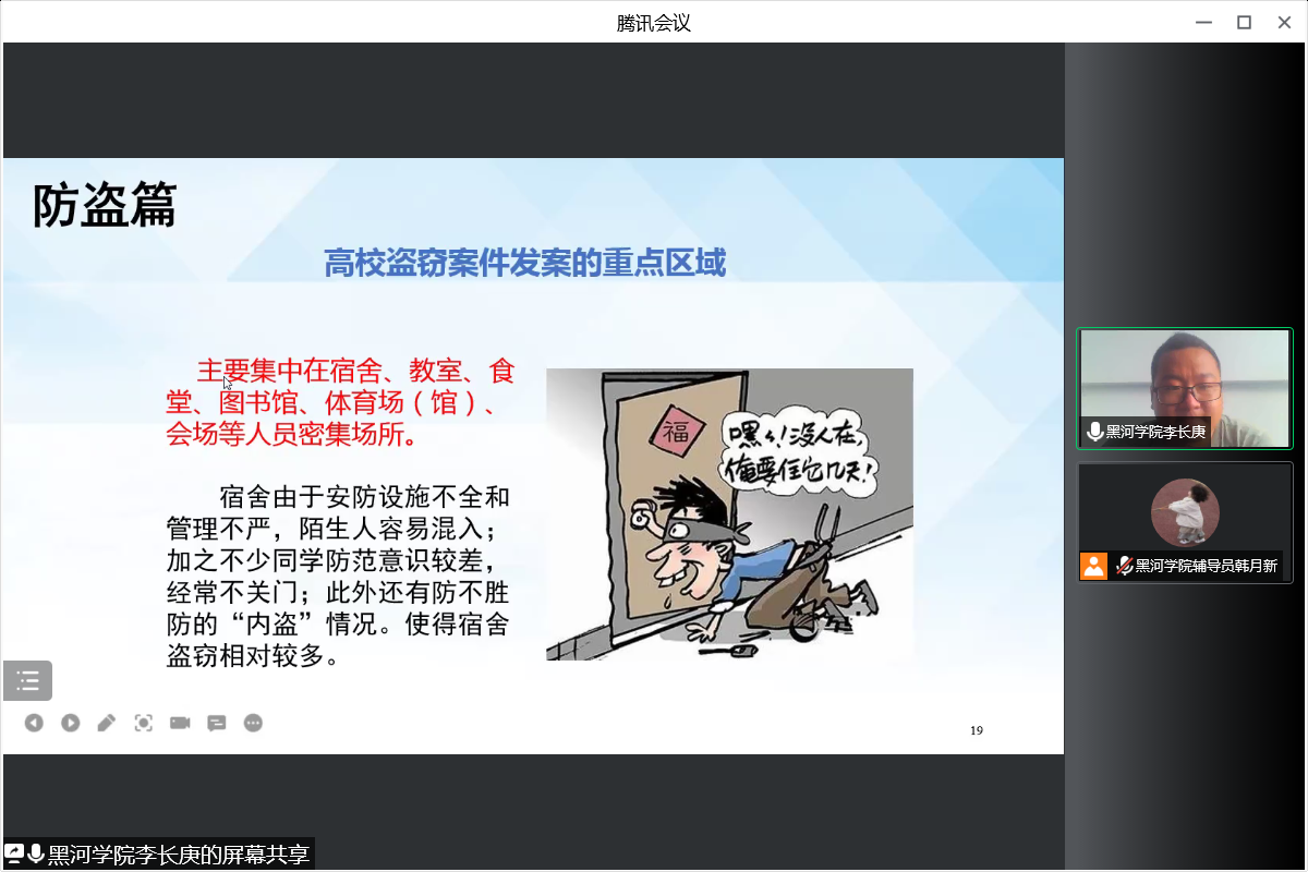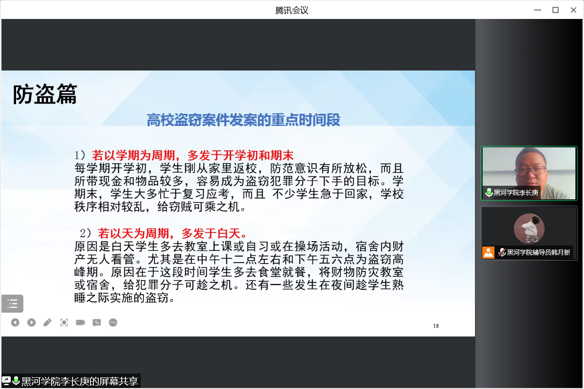会议分为两部分,李长庚老师首先讲解了有关安全教育的相关知识,从交通安全、饮食安全、用电安全以及防盗、防骗安全四个方面进行详细的讲解,其中还引用了现实中的例子来警醒学生,同时告诉学生遇到不同类型的安全事件应该如何去做。