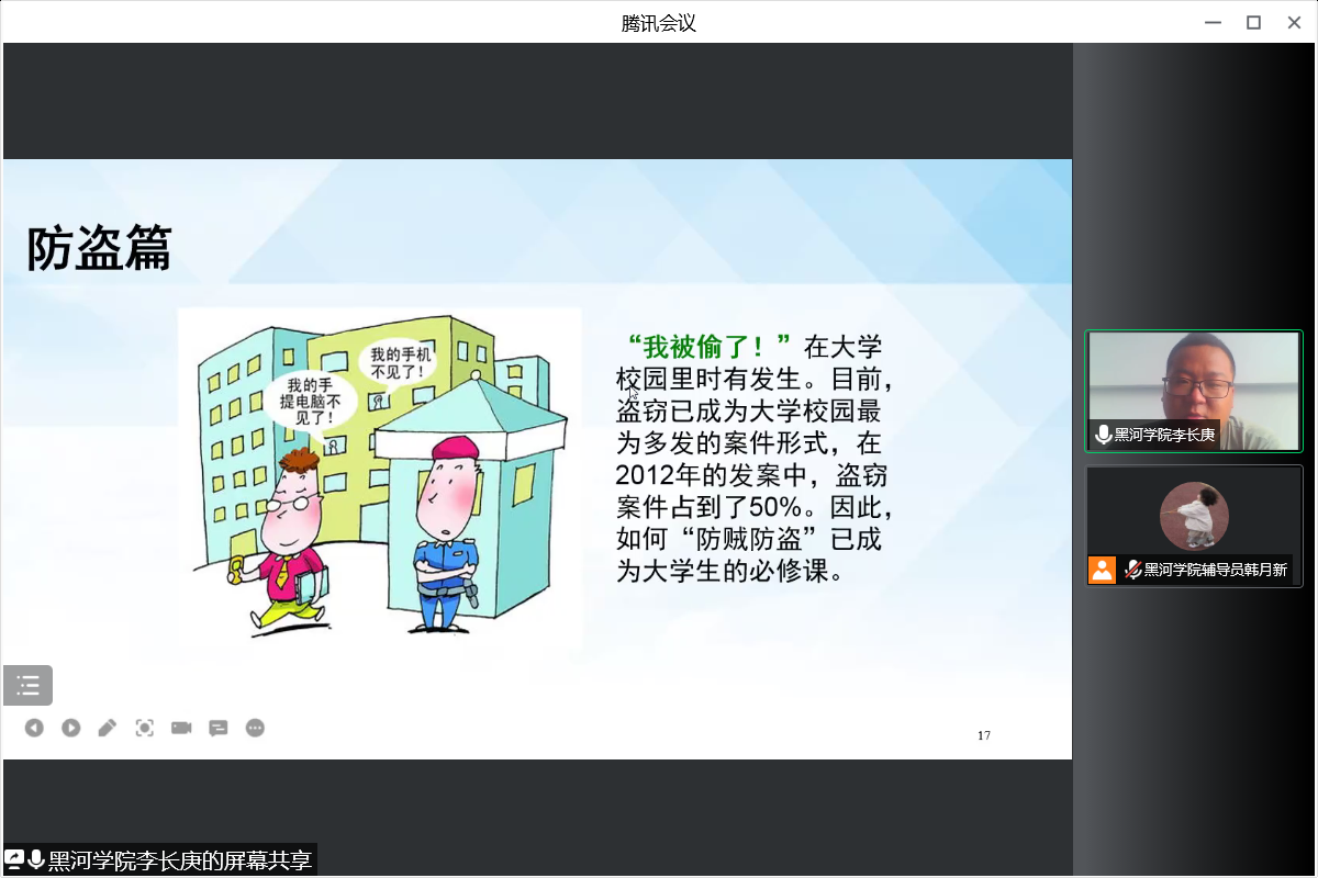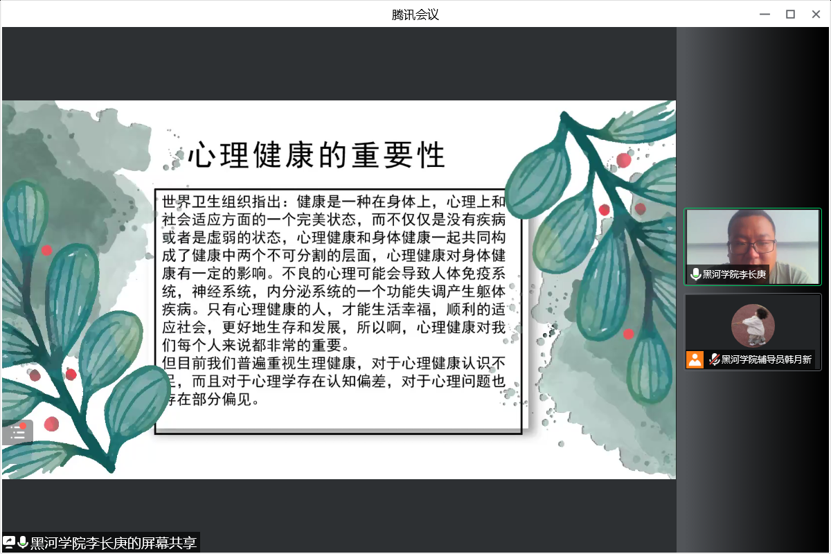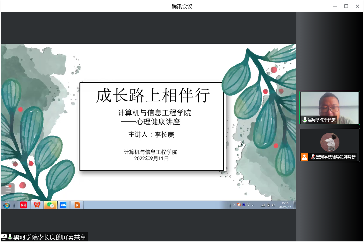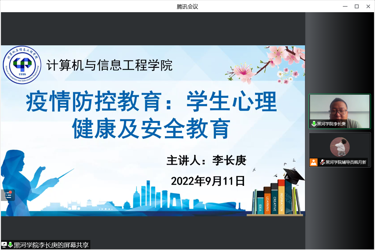 突如其来的疫情让开学按下了暂停键,安全无小事,新学期已经到来,为防范各类学生意外事故,进一步加强我院新生心理健康教育工作的宣传力度,关心学生们的心理健康,缓解负面心理情绪,计算机与信息工程学院于2022年9月11日下午15:00在腾讯会议召开主题为“学生心理健康及安全教育”的入学教育,会议由李长庚老师主讲。