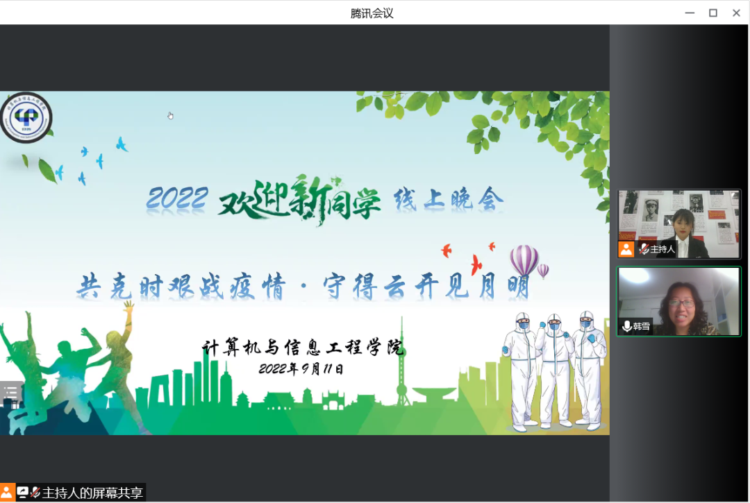 9月11日晚19:00,计算机信息与工程学院在腾讯会议举办“共克时艰战疫情·守得云开见月明”2022线上迎新晚会。本次晚会由21级物联网工程2班高艺萍主持。