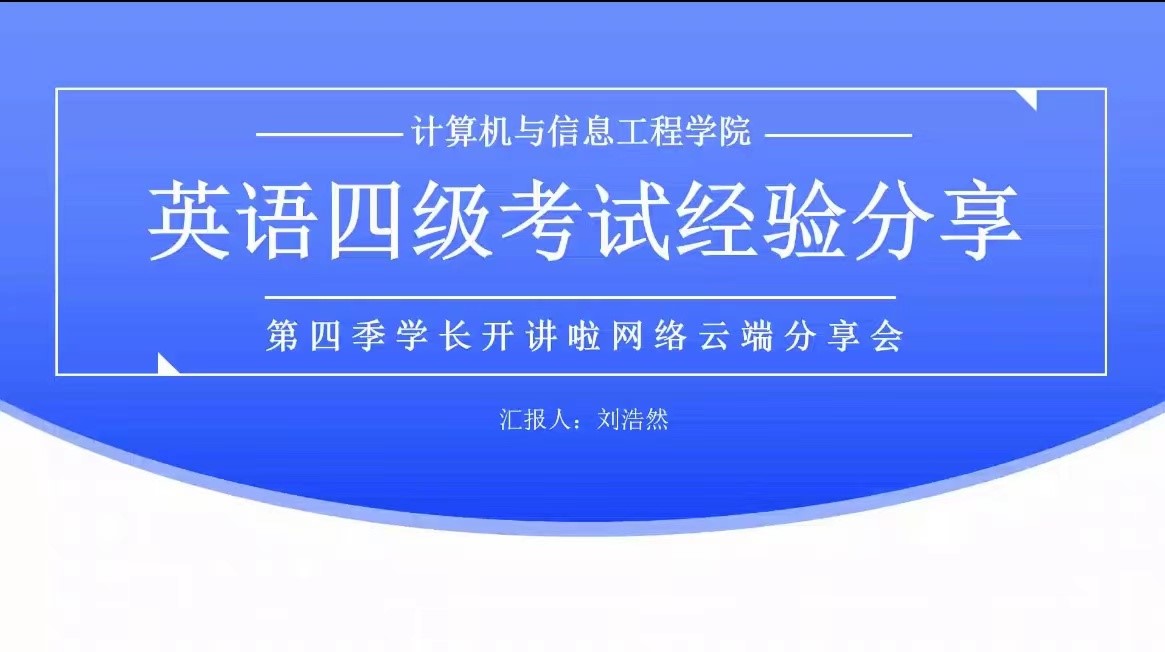 本次英语四级考试经验分享会,正式开起了我院思政品牌活动——学长开讲啦网络云端分享会第四季的序幕。我院将每周开展一次学长开讲啦网络云端分享会,从朋辈视角帮助同学们更好地适应大学生活,为毕业、就业做好准备。