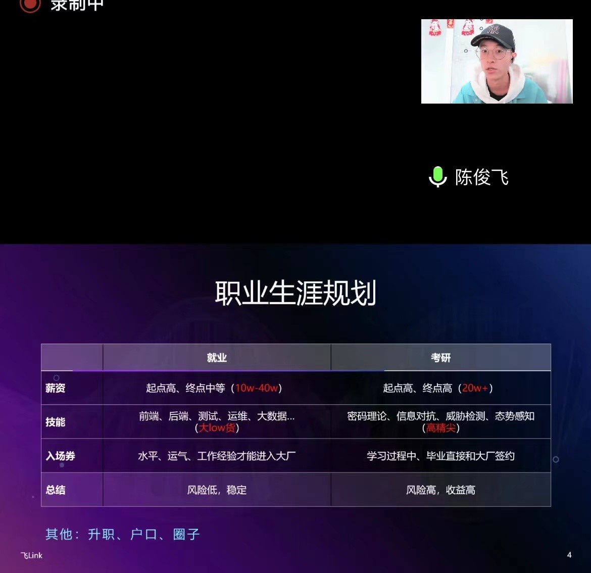 分享者陈俊飞学长目前任职于中国科学院信息工程研究所,担任大数据安全工程师一职。学长首先从薪资、技能等方面,以职业规划的方向详细地分析了就业与考研的利与弊,帮助同学们有了更加深入的了解,同时希望同学们学会认识自己,不跟风,不盲从,专注做一件事才会取得成功;其次学长从专业方向上为同学们讲解了不同的专业需要掌握的基础技能,并提出了自己的就业经验与建议。最后,同学们提出了比较关注的问题,陈俊飞学长一一进行了耐心解答。