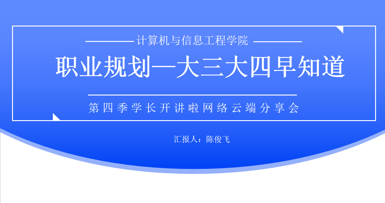 随着专业学习的不断深入,不少学生的心态也从最初的新鲜与好奇转为迷茫和困惑。为使同学们拥有源源不断的学习动力,对职业生涯有更深入的了解和更明晰的规划,计算机与信息工程学院于10月5日14:00在腾讯会议举办了“职业规划——大三大四早知道”经验分享会,邀请我院2022届陈俊飞学长分享了他在黑河学院学习生活、职业规划、求职技巧以及工作后的成长经历和宝贵经验。会议由辅导员张宇老师主持,22级、21级、20级、19级140余名学生聆听了分享会并参与了线上交流。