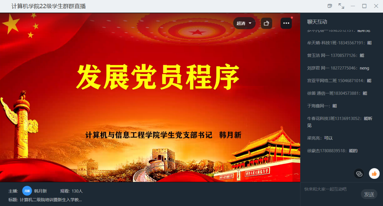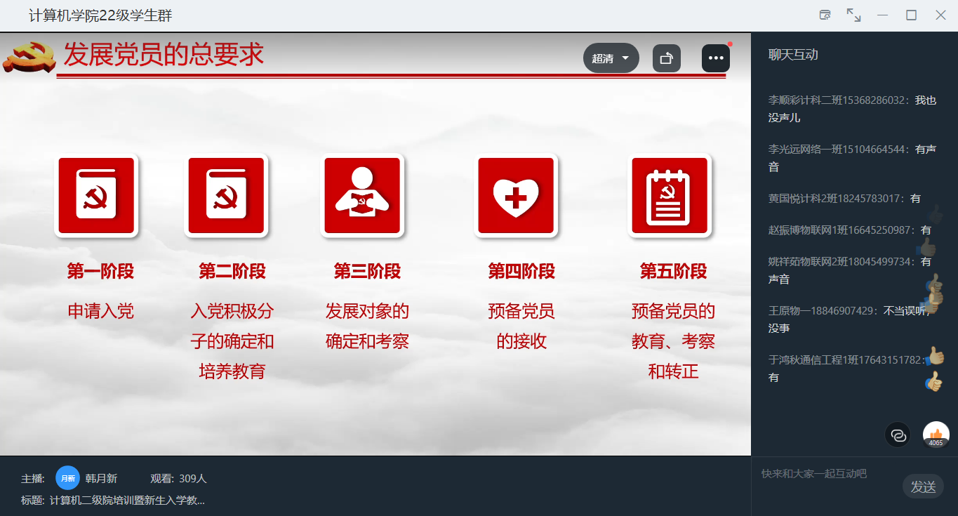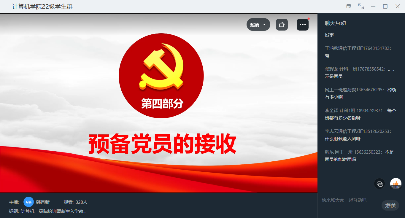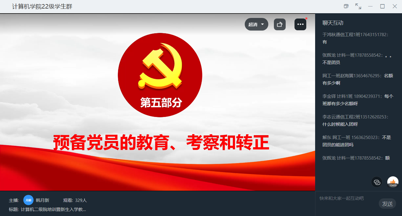 为帮助新生端正入党动机,以前进的姿态迎接党的二十大召开,为日后入党积极分子的培养考察和教育、党员发展工作打下坚实的基础,进一步推进学院学风教育工作,营造良好学习氛围,计算机与信息工程学院于10月9日召开二级培训暨新生入党启蒙教育,会议由学院学生党支部书记韩月新主持召开。
