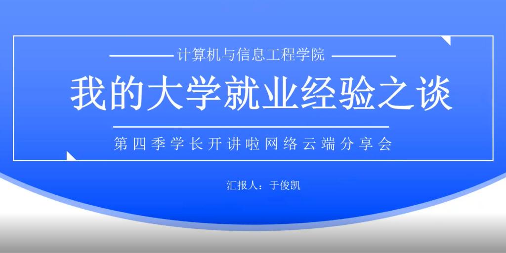 为充分发挥我院2022届毕业生就业典型的引领示范作用,引导在校生提前做好学业规划和求职准备,促进2023届毕业生高质量就业,10月15日晚19时,计算机与信息工程学院在腾讯会议举办第四季第5期学长开讲啦,此次分享的主题是“我的就业经验之谈”,由2022届毕业生于俊凯同学主讲。 |