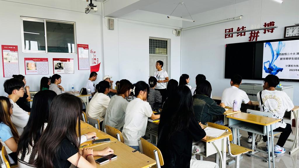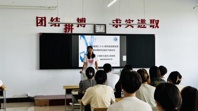 新程已启,万事可期。为进一步加强学院学生干部队伍建设,增强学生干部队伍的凝聚力和向心力。2023年8月21日中午12:00,我院在探知楼B301召开主题为“学思践悟二十大,踔力奋进新征程”新学期学生组织干部会议,参加本次会议的有辅导员张宇、杨雪莹、李长庚、彭森以及全体学生组织干部。
