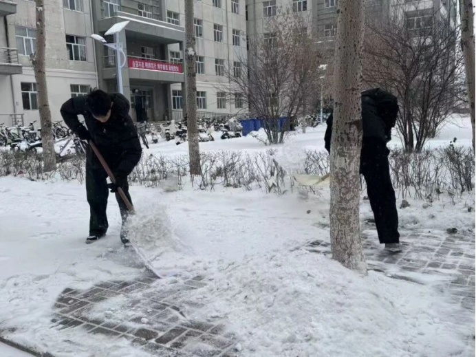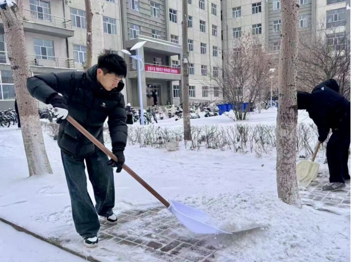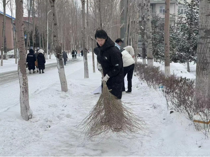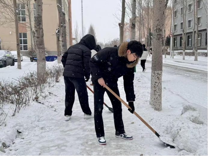 活动现场,志愿者们迅速分工、默契协作。大家手持铁锹、扫帚、推雪板等工具,重点对校园主干道、教学楼出入口、食堂通道、台阶坡道等易滑区域进行全面清雪除冰。有的挥舞铁锹破冰铲雪,有的手持扫帚清扫残雪,有的合力推动推雪板集中清运,哪怕是角落缝隙里的薄冰,也用工具细心铲除;同时主动排查路面结冰点、台阶打滑处等潜在安全隐患,在关键路段协助设置“小心地滑”提示标识,及时提醒过往师生注意出行安全。寒风中,志愿者们的身影格外醒目,纷飞的雪花与额头的汗水相映,弯腰劳作的姿态、认真负责的神情,成为校园里一道温暖的风景线。
