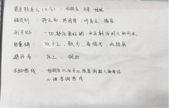 班会最后以“情绪急救包”收尾,同学们制作专属情绪资源库,填写倾诉对象、舒缓方式、安心场所及求助热线,将方法系统化,构筑起坚实的情绪防护屏障。