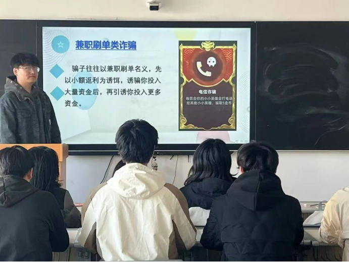反诈消防并举,提升自我保护能力。班会内容涵盖常见诈骗手段识别、网络兼职陷阱、冒充熟人诈骗等典型案例,帮助学生掌握“不听、不信、不转账”的防骗要领。同时,消防部分重点讲解宿舍用电安全、火灾逃生技巧及灭火器使用方法,强化学生应急处理能力。