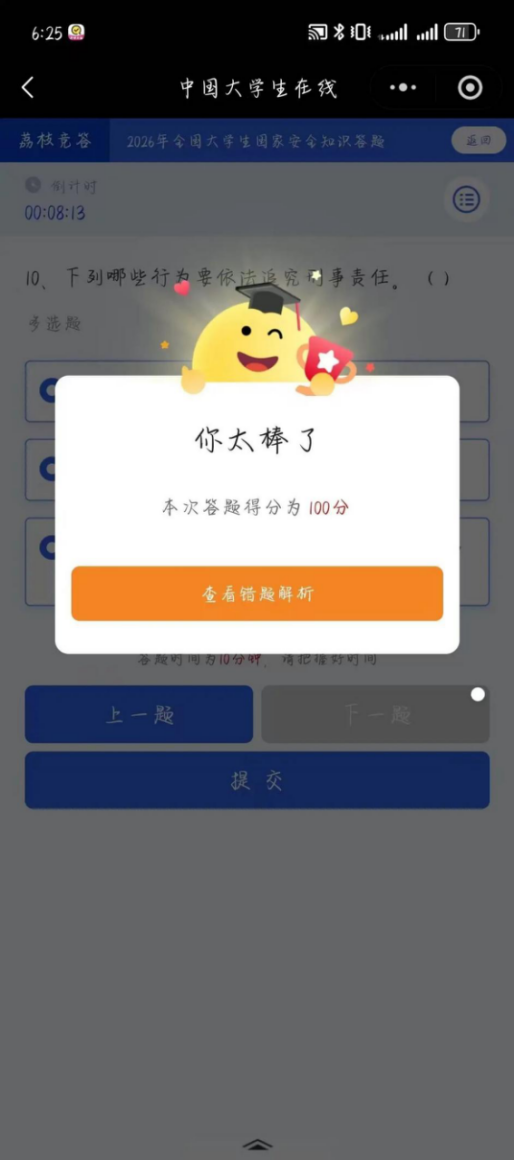 观看结束后,我院积极鼓励以学促践,同步组织全体学生参与线上国家安全知识专项答题活动。在沉浸式答题实操中查漏补缺、巩固所学,把课堂上学到的国家安全理论知识转化为熟记于心的安全常识。