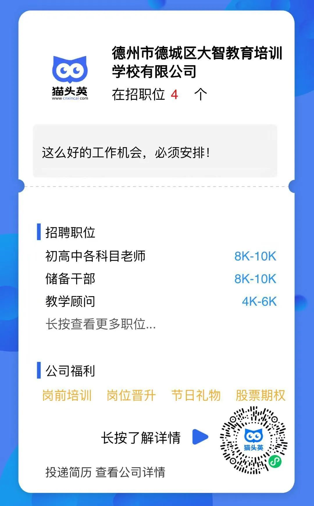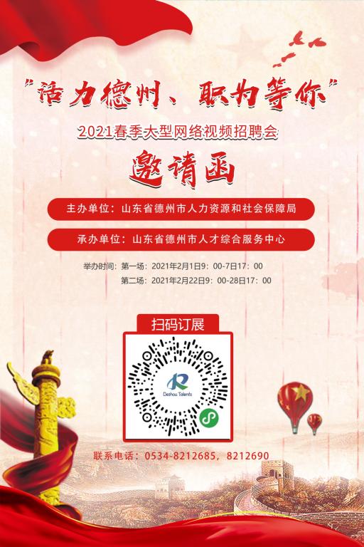 长风破浪开新局,人才引领育新机。“活力德州职为等你”山东德州2021春季大型网络招聘会开始啦!想找工作的小伙伴们集合啦!快来看看有你心仪的岗位吗?千万不要错过哦......本次活动是由山东省德州市人力资源和社会保障局主办,覆盖我市国有企业、事业单位、实力民企近500家,提供优质岗位2万多个,还有最高20万元的购房补贴和每月5000元的生活补贴哦,是不是已经心动了呢,那就快快报名参加吧!