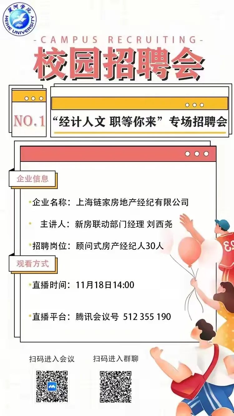 11月18日下午14:00,“经计人文 传经授道”系列专场招聘会暨首场上海链家校园招聘会如期举行,我院高度重视此次招聘活动,在2022届毕业生中广泛宣传、动员,积极鼓励同学们把握就业机会,树立先就业再择业的科学就业观念;同时在低年级学生群里也进行了积极动员,让学生们早一步树立就业意识,进而激发其学习动力。本次专场招聘会我院共有44名学生参与,有签约意向1人。