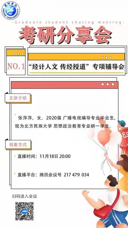 在考前一个月的关键冲刺阶段,为进一步帮助考研学生缓解心理压力,并获得考研成功上岸学长们的“真经”,11月18日晚20:00,首期“经计人文 传经授道”专项分享会暨考研分享会在腾讯会议如期举行,人文传媒学院2020届广播电视编导专业毕业生、现为北方民族大学思想政治教育专业研二学生张萍萍同学做专题分享,我院共有37名学生参与。