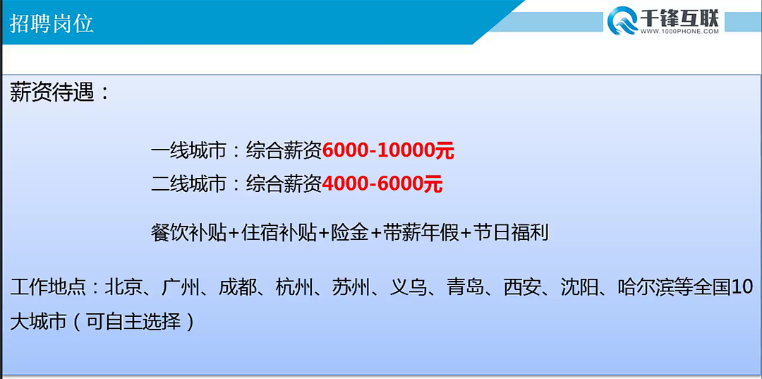 一线城市:6000-10000/月+提成+绩效奖金+险金+餐补+住房补贴;