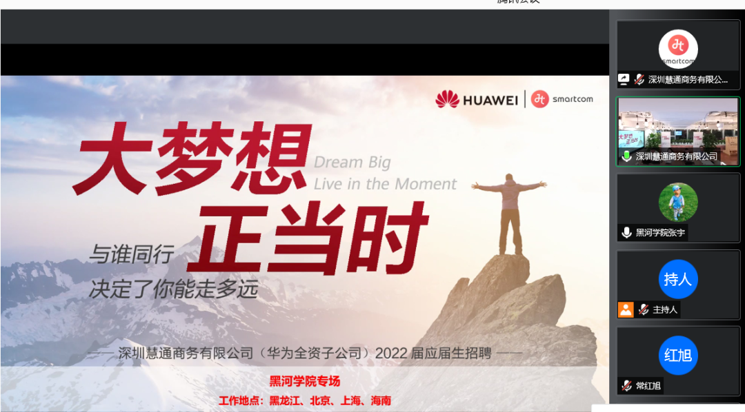 会议由我院张宇老师主持,深圳慧通商务有限公司黑龙江终端业务部王自成副部长做招聘宣讲。作为华为全资子公司的深圳慧通商务有限公司,在本次专场招聘会上提供了涵盖上海、北京、黑龙江省和海南省四地共计244人的招聘需求。