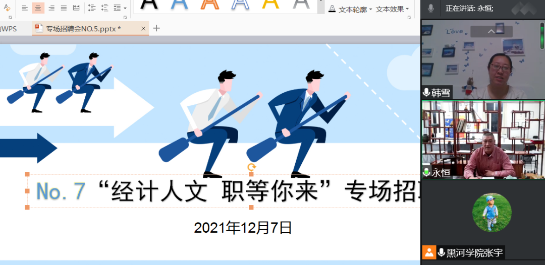 为进一步拓宽我校2022届毕业生就业渠道,推动我院2022届毕业生实现更高质量更充分就业,12月7日18:30通过腾讯会议,我院2008届闫永恒和王志超两位优秀校友,携一笔一墨文化艺术有限公司面向全校召开空中专场招聘会。我院刘心声院长、韩雪书记参加了本次招聘会,辅导员张宇老师主持。