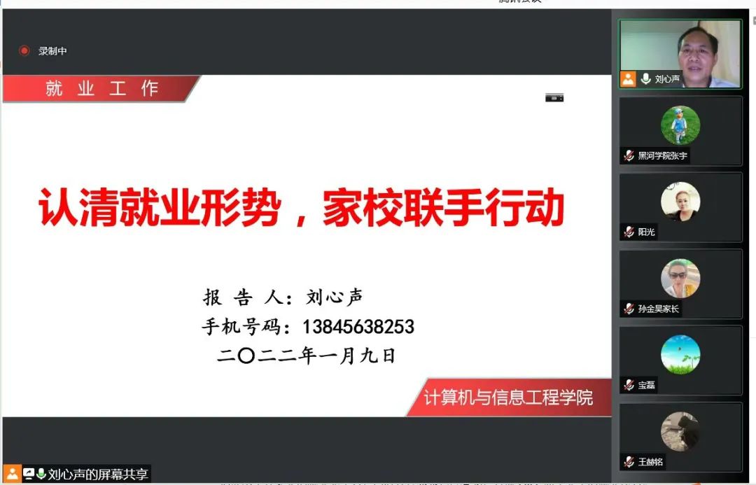 新年伊始,万象更新。为进一步落实2022届毕业生就业去向,保障学生高质量就业,根据学院就业工作领导小组制定的2022年就业工作计划,1月9日19:00,计算机与信息工程学院在腾讯会议召开了“认清就业形势 家校联手行动”2022届毕业生就业工作家校联动会。刘心声院长、韩雪书记出席本次会议,全体毕业设计指导教师和230余名家长参会,会议由学团办主任张宇主持。