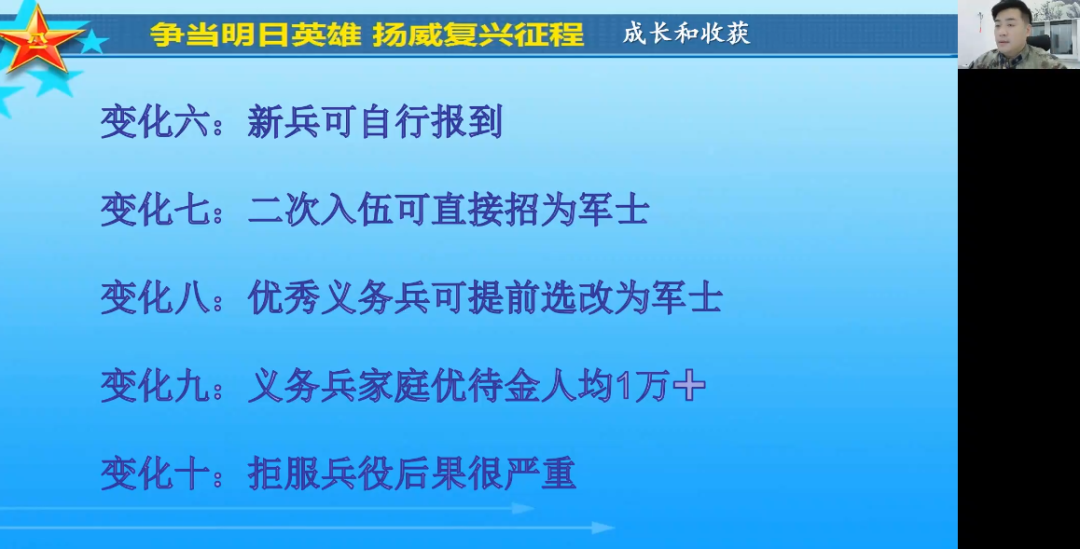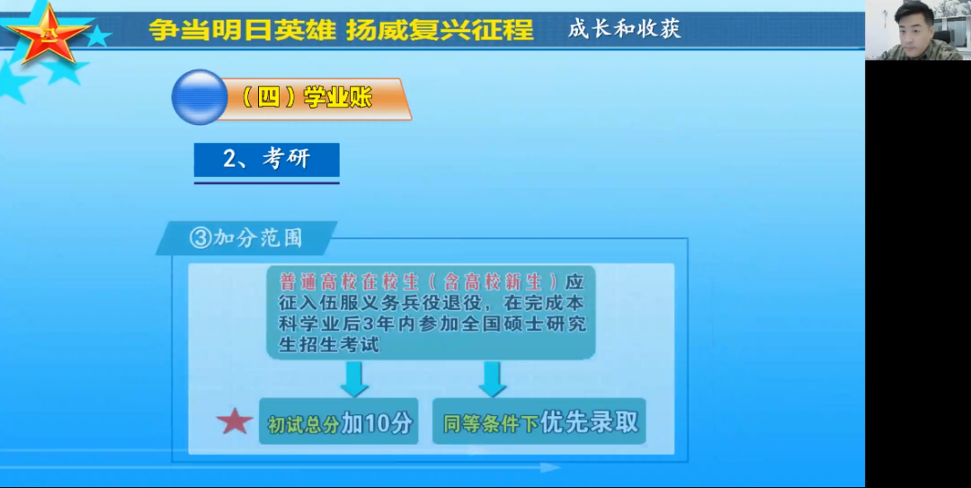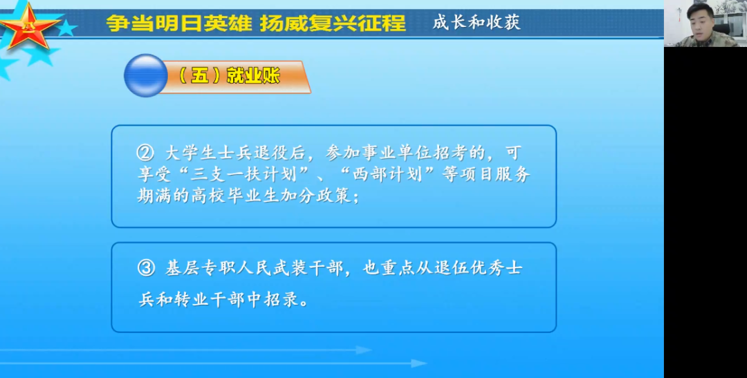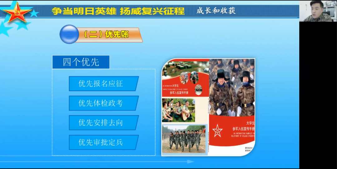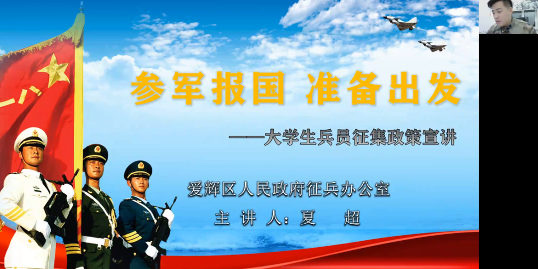 为持续做好我院2022届毕业生就业工作,结合我院男生人数占比较高的实际情况,4月2日19时,我院特邀黑河市爱辉区人武部军事科夏科长,为我院全体就业指导教师做大学生应征兵入伍专项培训讲座,暨我院第三期基层专业就业政策培训,学院领导、32名就业指导教师和3名辅导员全部参会。