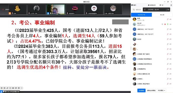 为了做好我院2022级学生就业工作,我院领导未雨绸缪、厉兵秣马。于2023年2月8日召开了以“‘职’引未来,同心筑梦“为主题的2022级家校同心筑梦工作推进会线上会。会议由院长刘心声、辅导员彭森共同主持。
