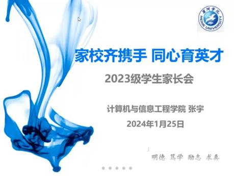 为进一步凝聚家校育人合力,加强家校沟通交流,助力学生成长成才,2024年1月25日19:00,计算机与信息工程学院于腾讯会议召开“家校齐携手,同心育英才”23级学生家长会。23级辅导员张宇老师主持,百名23级学生家长参加