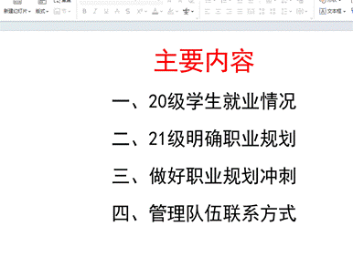 此次会议共从20级学生就业情况、21级明确职业规划、做好职业规划冲刺、管理队伍联系方式四个方面进行了详细的介绍,通过刘院长的细心讲解让2021级准毕业生们对自己未来就业发展有了更多的了解,并对接下来的学习及择业方向有了更多想法。