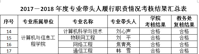 经过学院初审、学校教务处终审,2017-2018学年度我院的四个专业的专业带头人、三位教学骨干教师履职考核均合格通过,希望各专业带头人、骨干教师在新的一年里,再接再厉,在专业建设、教学改革方面带领各自教学团队做出更大的成绩!