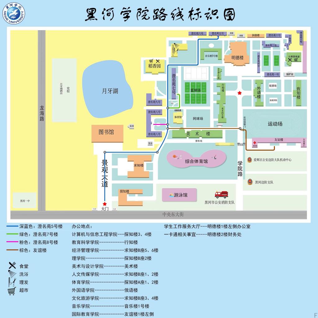 6.预计20分钟后,新生和家长们楼下集合,已经在网上成功全套购买行李备品的新生们,由学院志愿者引导前往致知楼领取床垫和床上用品;反之则由学院志愿者引导至新综合体育馆自行购买所需相关物品(附黑河学院平面地图)