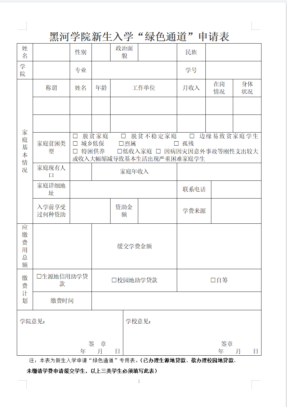 4.已经办理生源地国家助学贷款、准备办理校园地国家助学贷款和申请缓交费用的同学需填写《黑河学院新生入学“绿色通道”申请表》,填写完毕后到校“绿色通道”迎新窗口办理相关手续(附表)