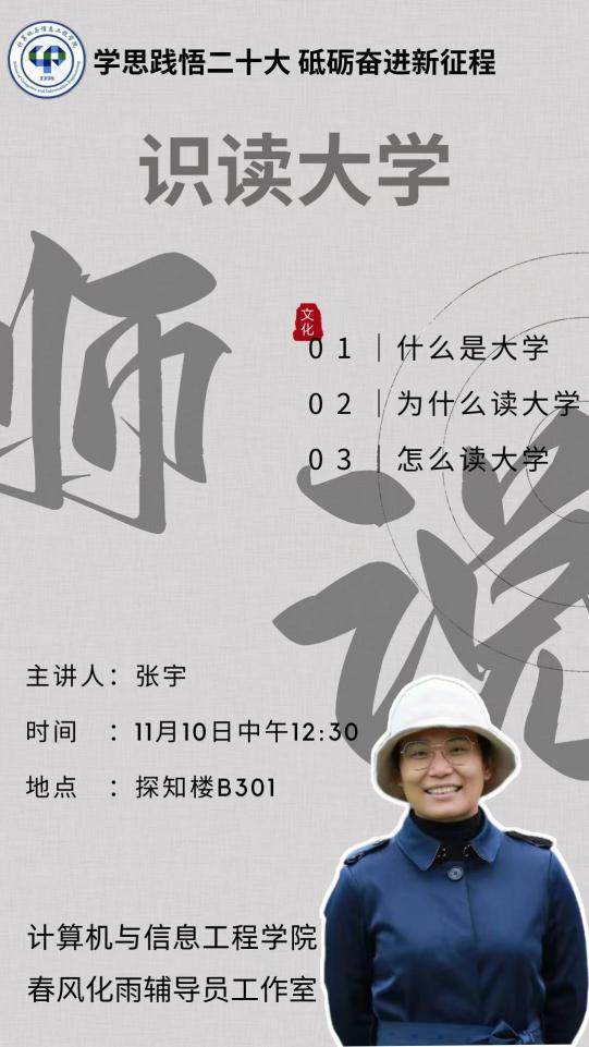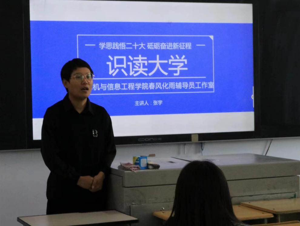 为常态化做好学思践悟二十大学习教育活动,更好地发挥辅导员工作室育人作用,11月10日中午12点半在探知楼B301教室,计算机与信息工程学院春风化雨辅导员工作室举办“师说”专题讲座活动,本次讲座主题为识读大学,由工作室主持人张宇老师主讲,40名2023级学生参加。
