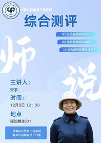 为了提高学生综合素质,激励学生德、智、体、美、劳全面发展,积极引导学生,培养创新精神和实践能力,成为有理想、有道德、有文化、有纪律的社会主义建设者和可靠接班人,12月5日中午12点半在探知楼B301教室,计算机与信息工程学院春风化雨辅导员工作室举办“师说”专题讲座活动,本次讲座主题为综合测评,由工作室主持人张宇老师主讲,60名2023级学生参加。